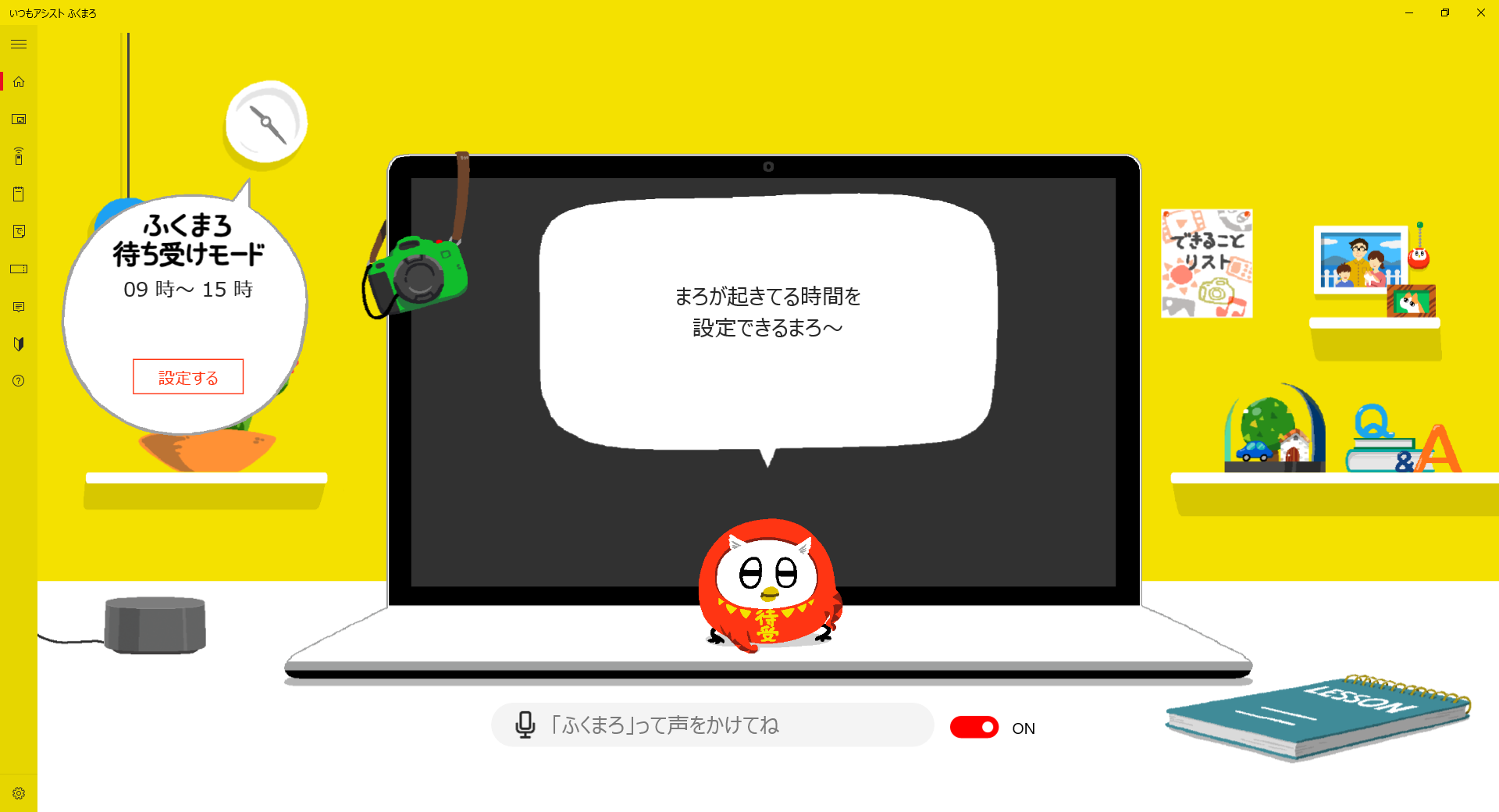 ふくまろはあなたのパソコンの中に住んでいます。パソコンがスリープしているとふくまろもおやすみしてしまいます。あなたが話しかけた時にふくまろが起きていてくれるようにするため、「ふくまろ待ち受け時間」「リモート起動」の設定をすることができます。
