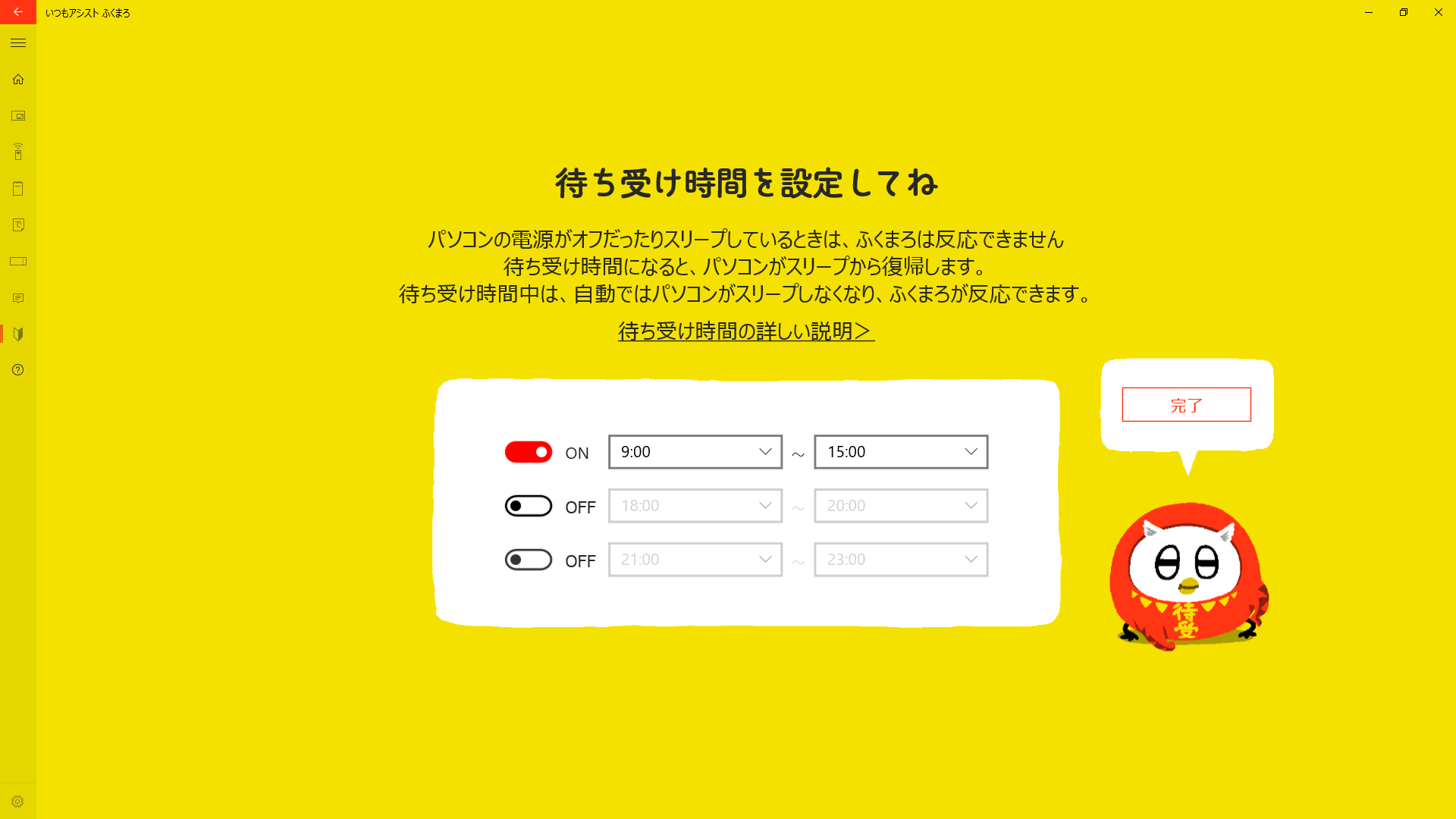 「ふくまろ待ち受け時間」は、パソコンをスリープさせない時間を設定し、その時間内であればいつでもふくまろと会話できるようにします。