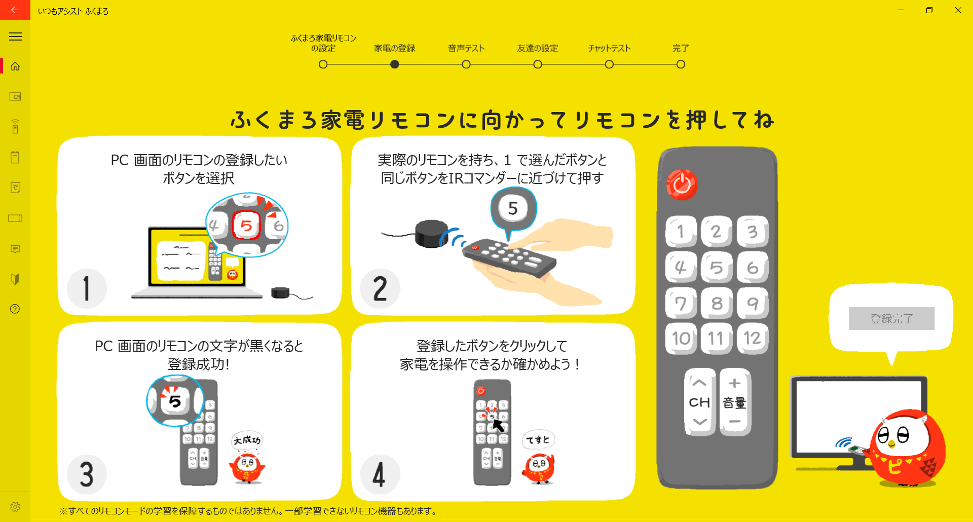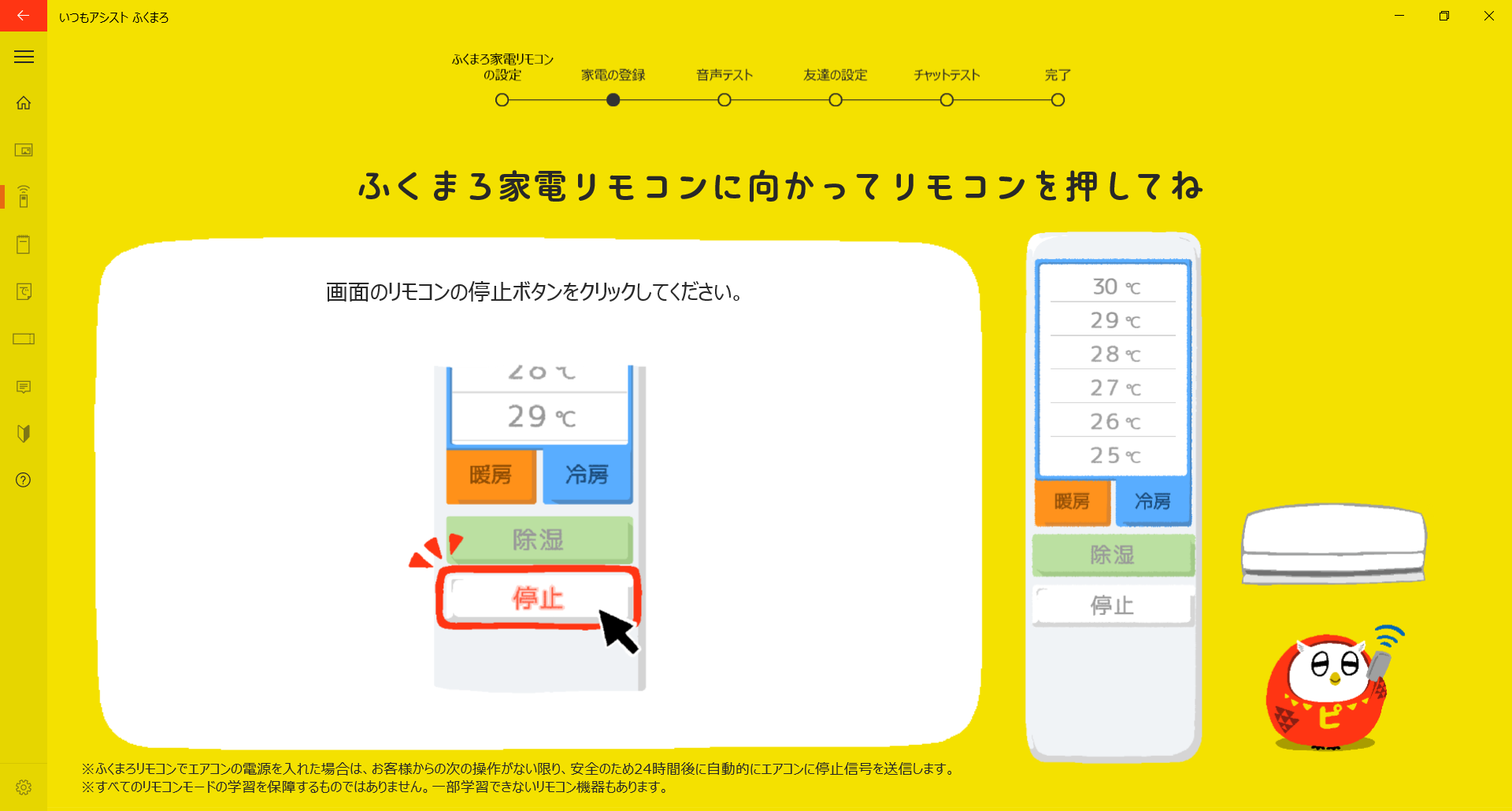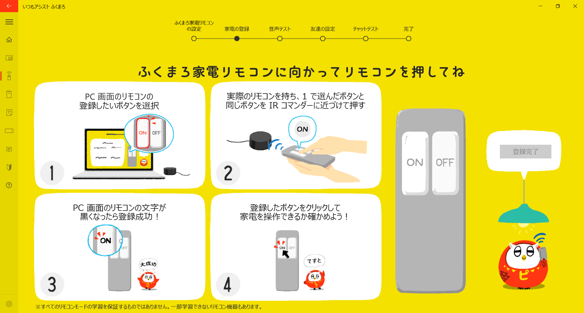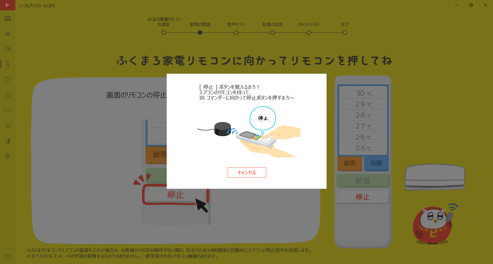 ふくまろ家電リモコンに向けてリモコンを操作するよう指示がありますので、選択した操作を実行してください。