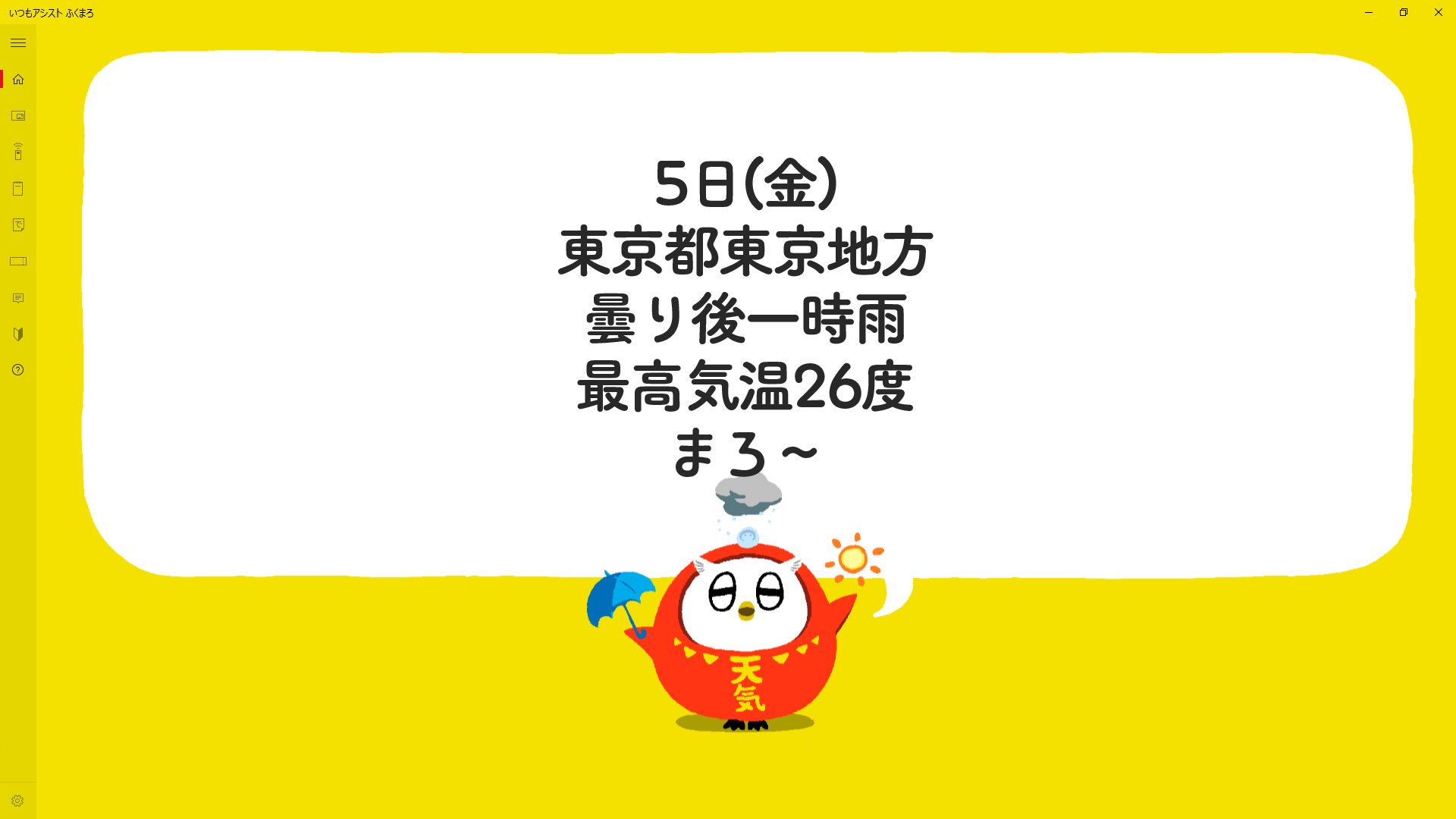天気予報を聞くには、ふくまろに「今日の天気教えて」「明日の天気教えて」と話しかけてください。