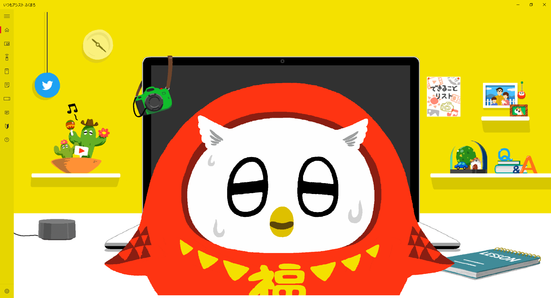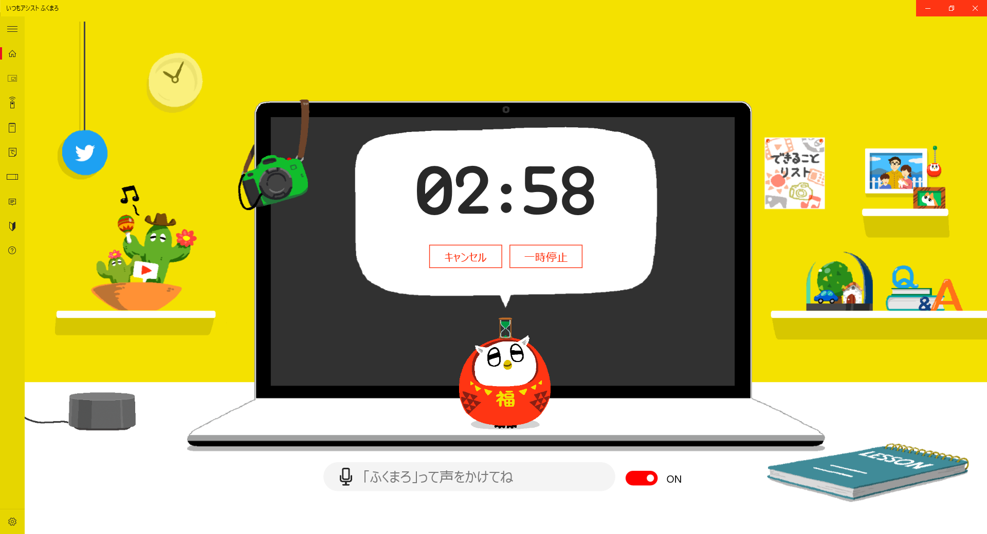 ふくまろに時間を教えてもらってはどうでしょう。ふくまろに「いま何時?」「きょう何曜日?」と話しかけてみてください。