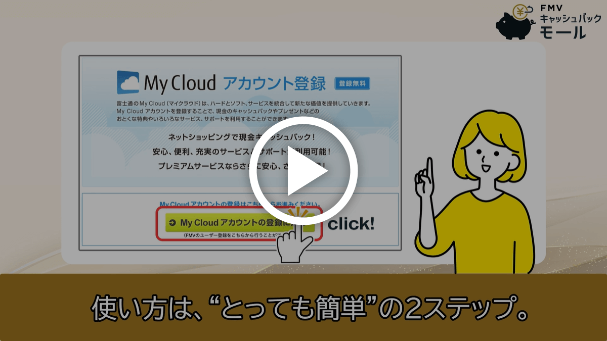 My Cloud アカウント(無料)にご登録いただければ、どなたでも無料でご利用いただくことができます。そのほか、キャッシュバック還元額(料率)がアップするFMV プレミアムサービス(有料)もございますので、併せてご検討ください。