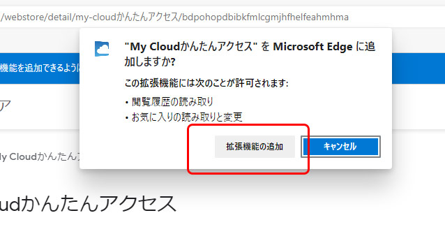 ④「"My Cloudかんたんアクセス"をMicrosoft Edgeに追加しますか?」というメッセージが表示されたら拡張機能の追加」をクリックします。