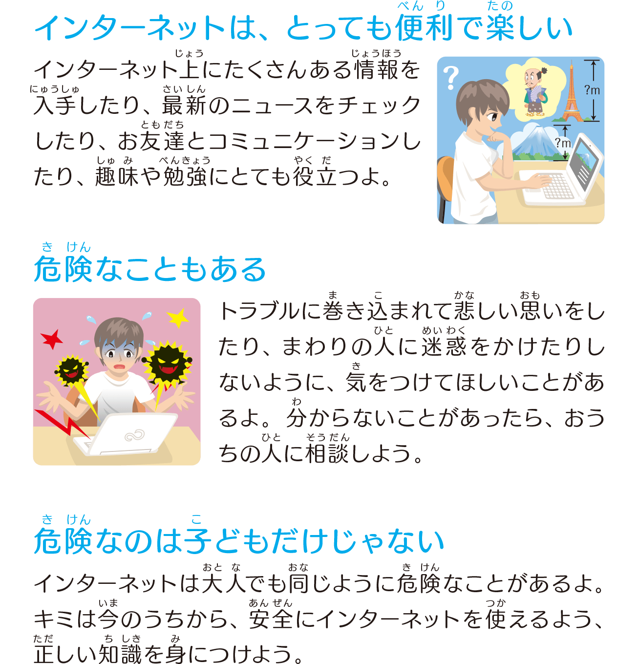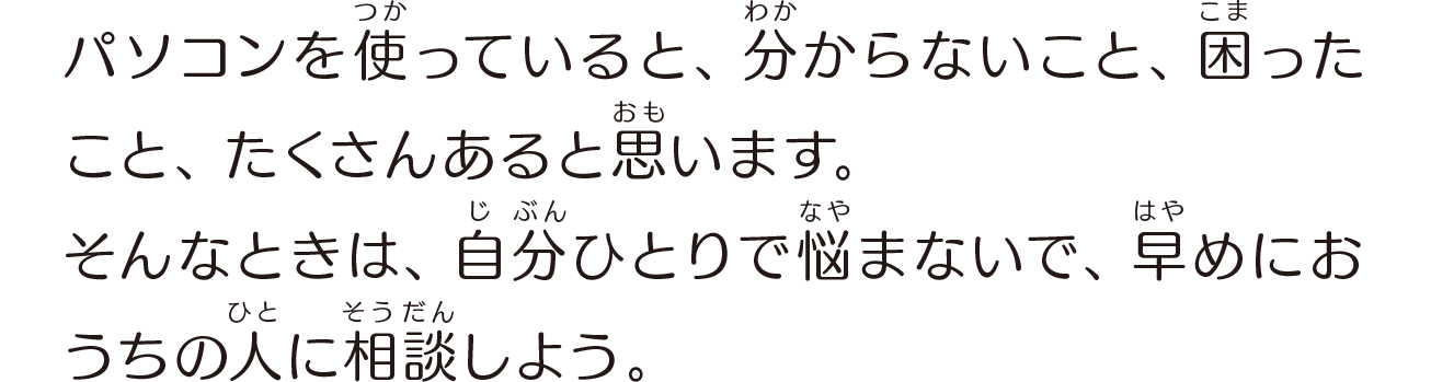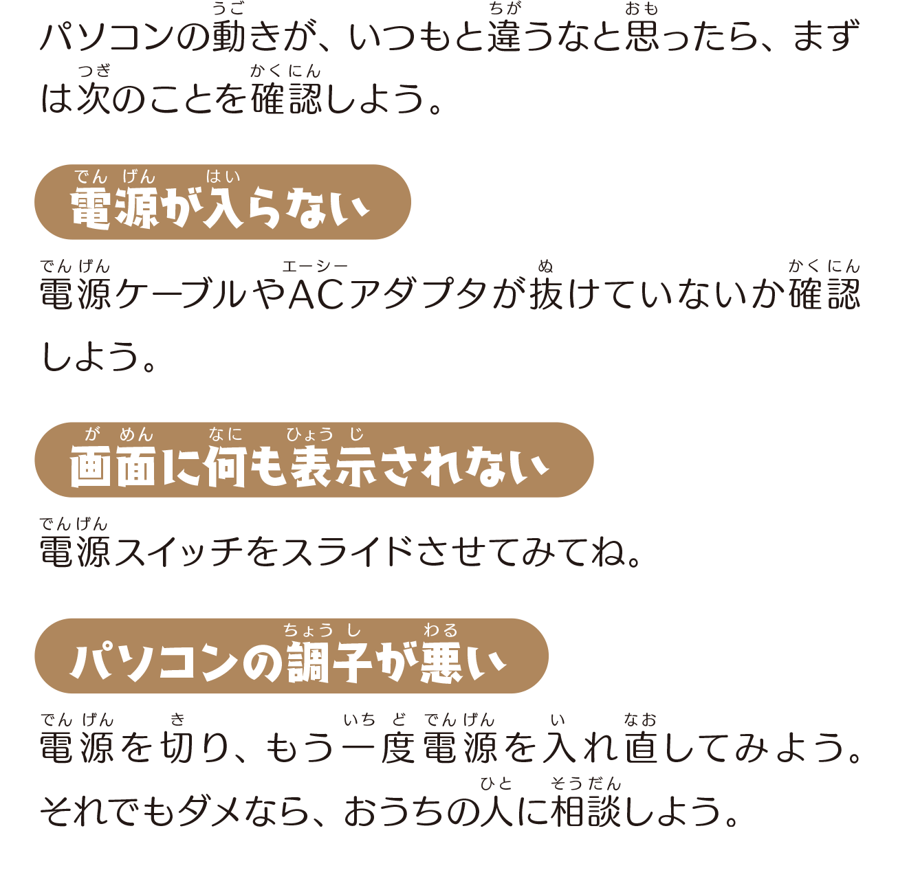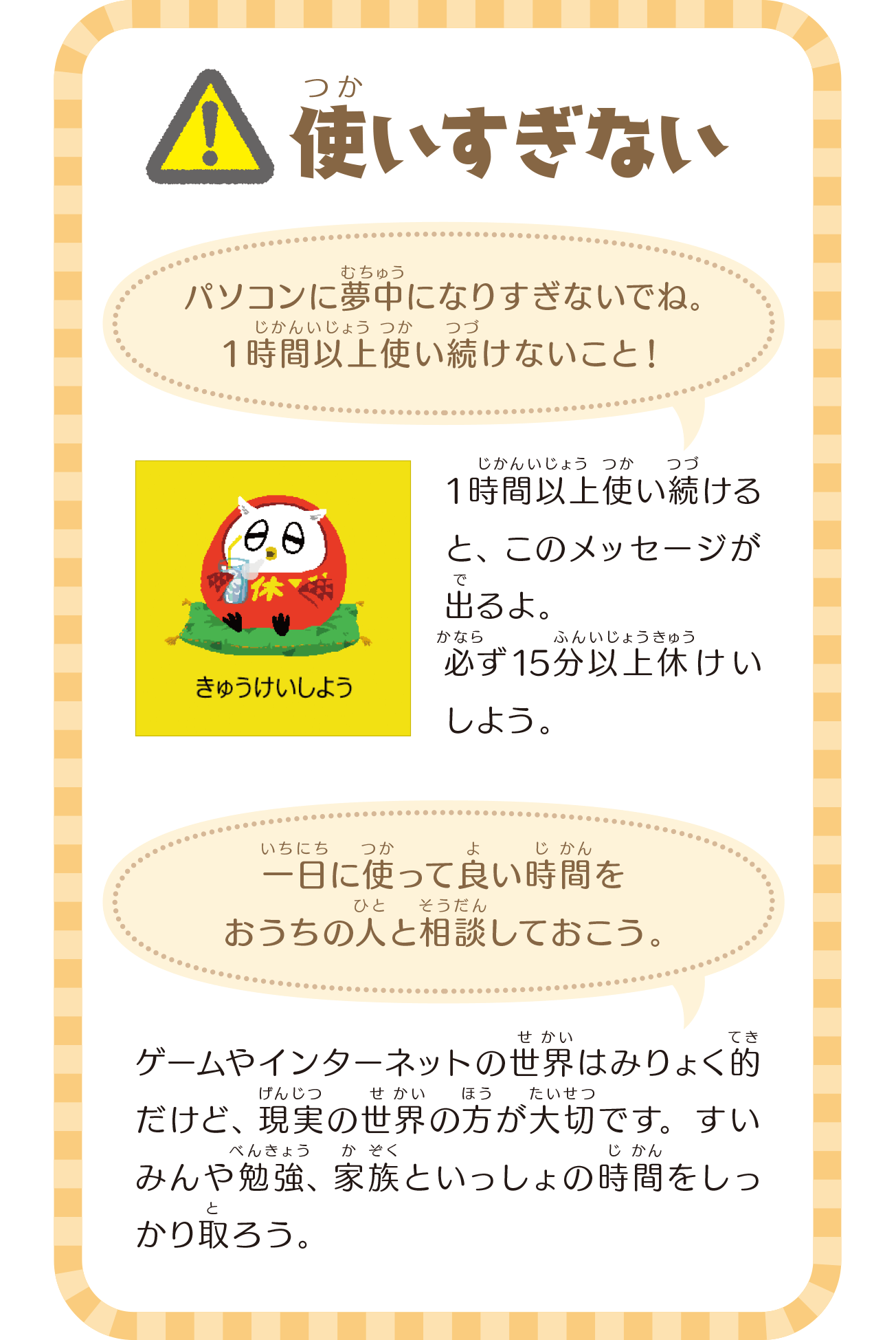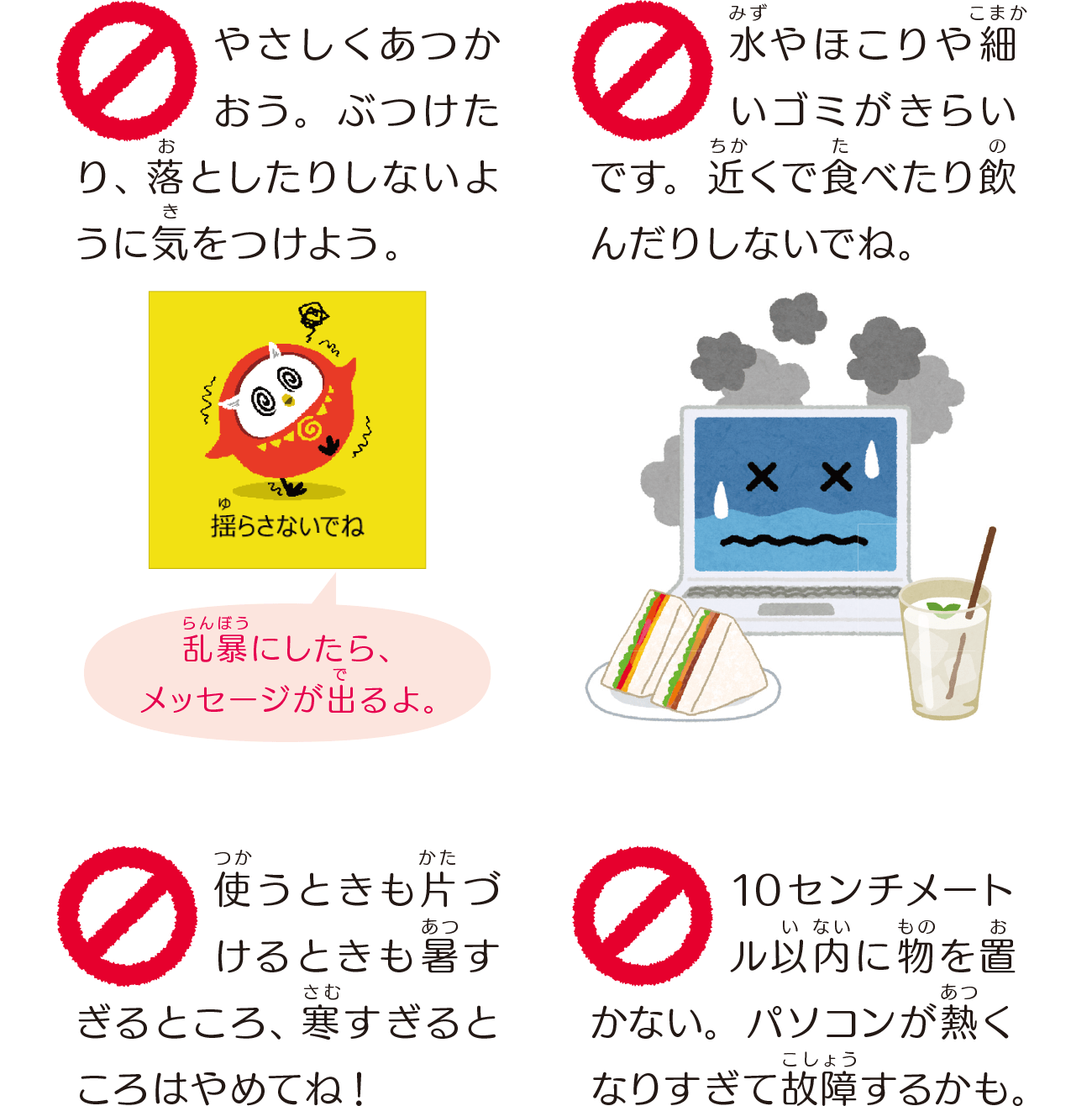 パソコンを使いはじめて、ワクワク、ドキドキしてるかな?たくさんさわって、使い方をおぼえてね。 でもその前に、3つのやくそくがあるよ。