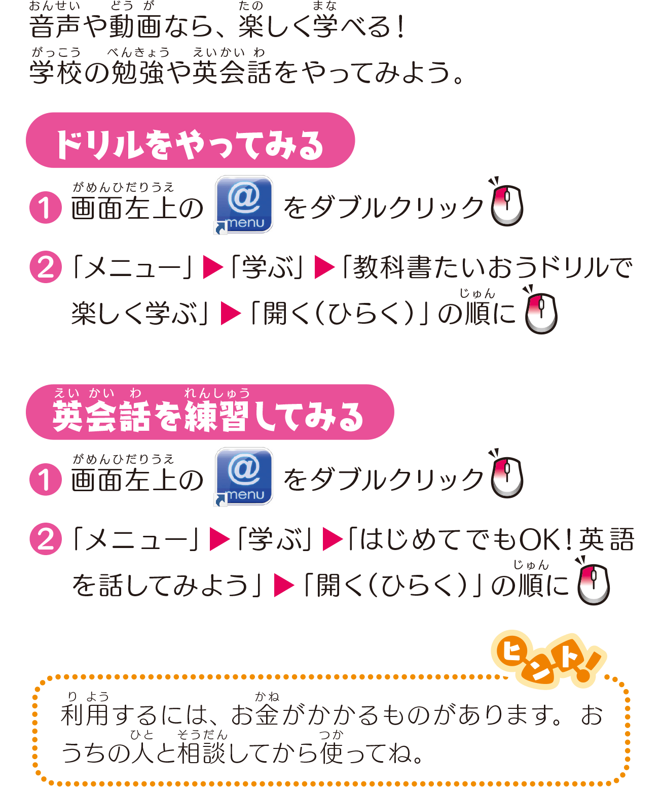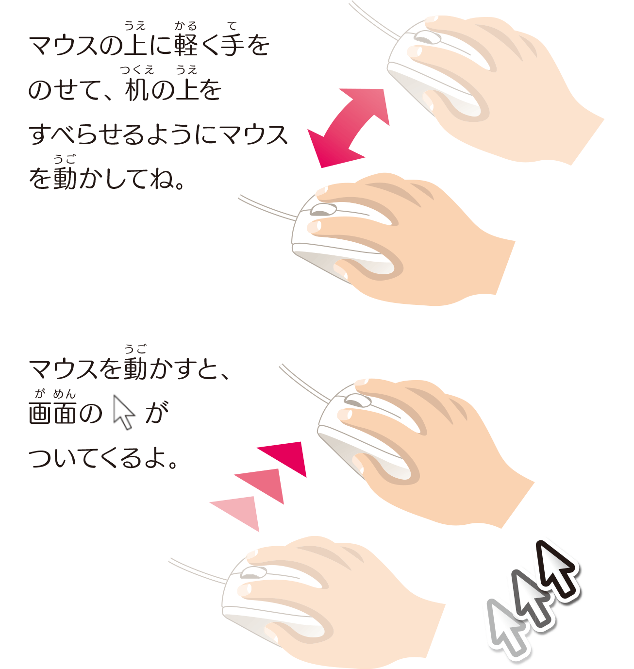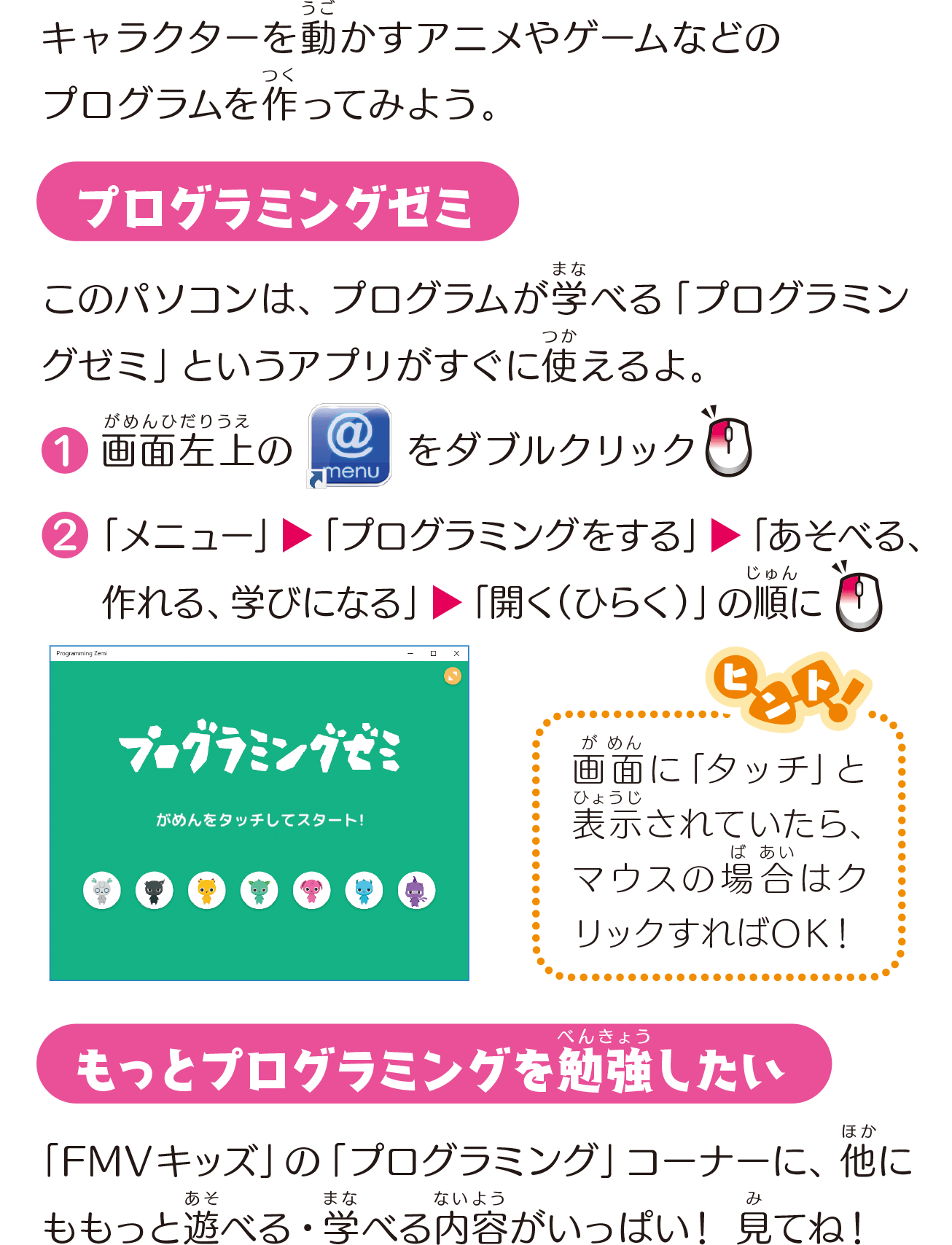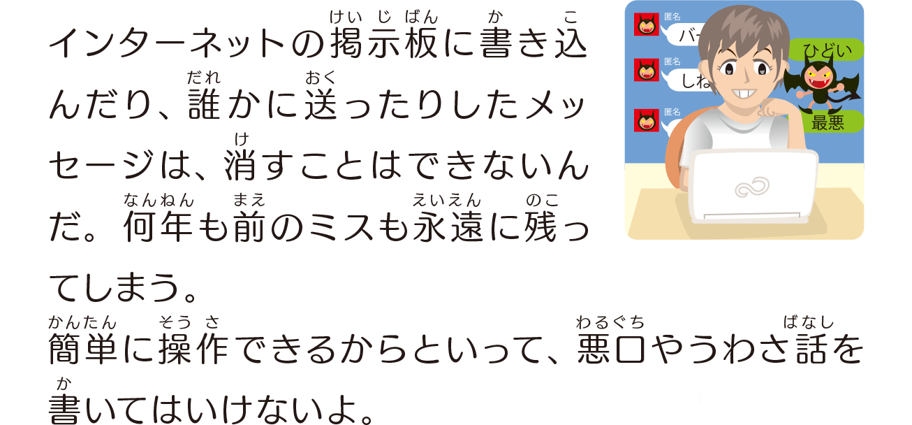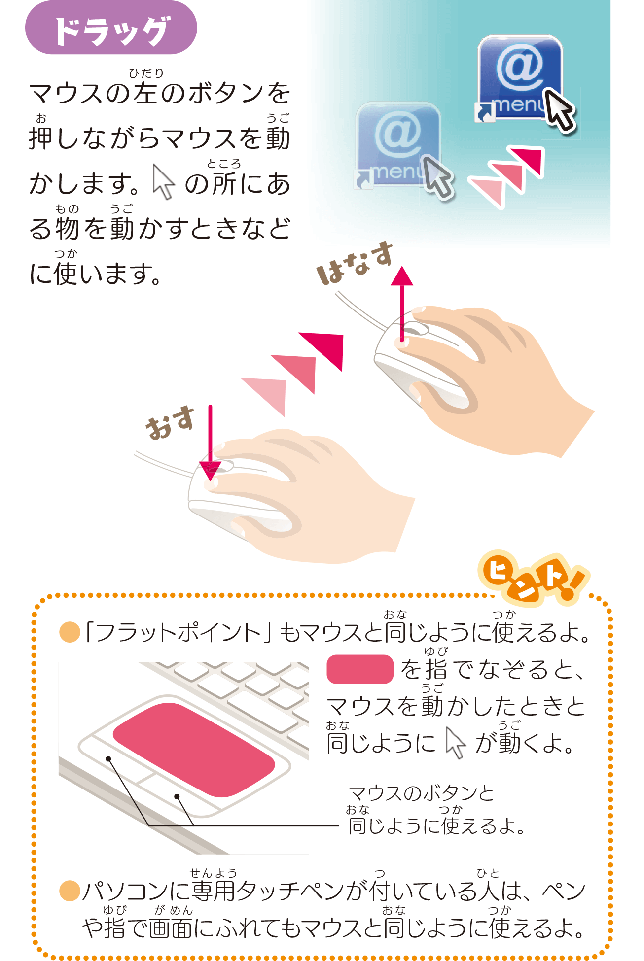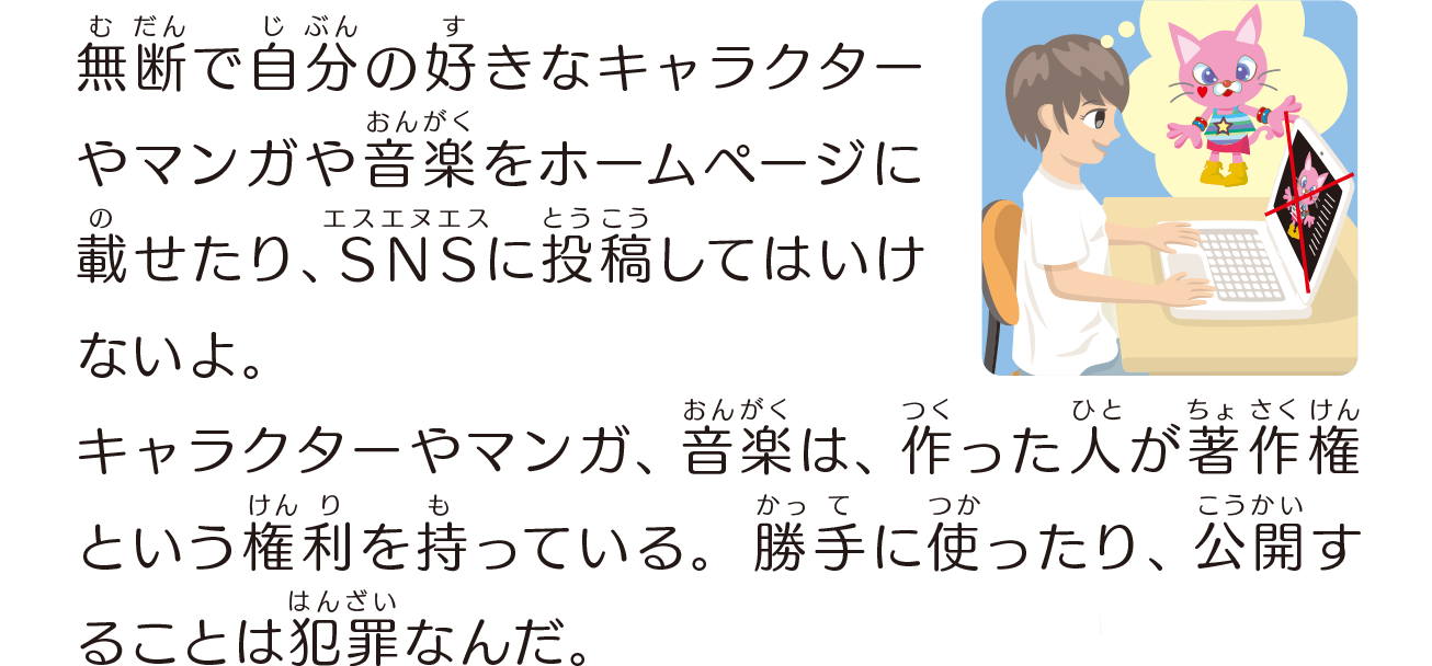 パソコンを使いはじめて、ワクワク、ドキドキしてるかな?たくさんさわって、使い方をおぼえてね。 でもその前に、3つのやくそくがあるよ。