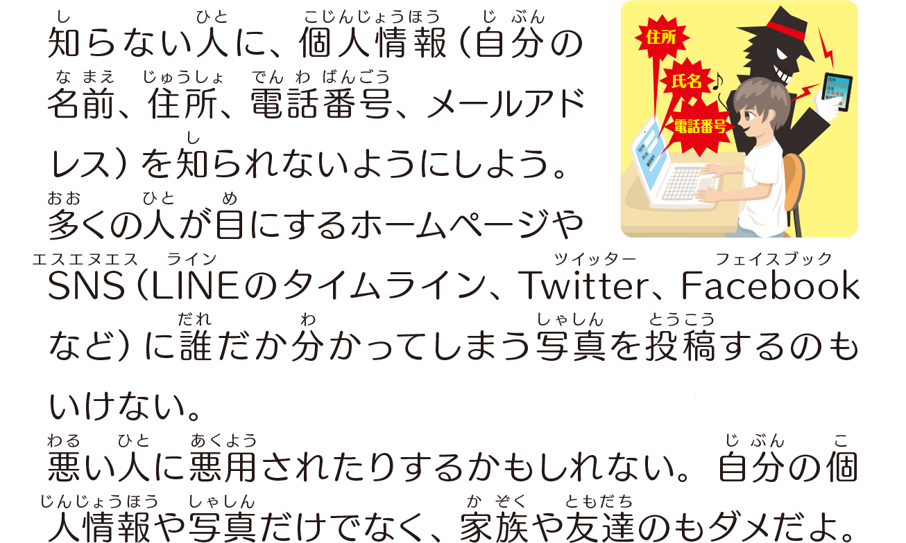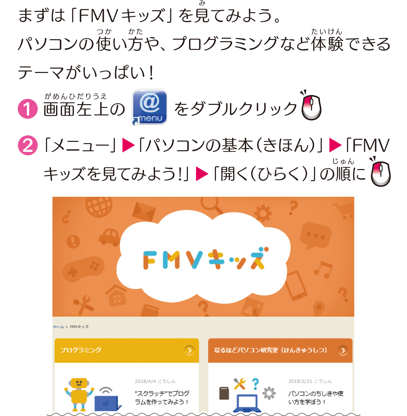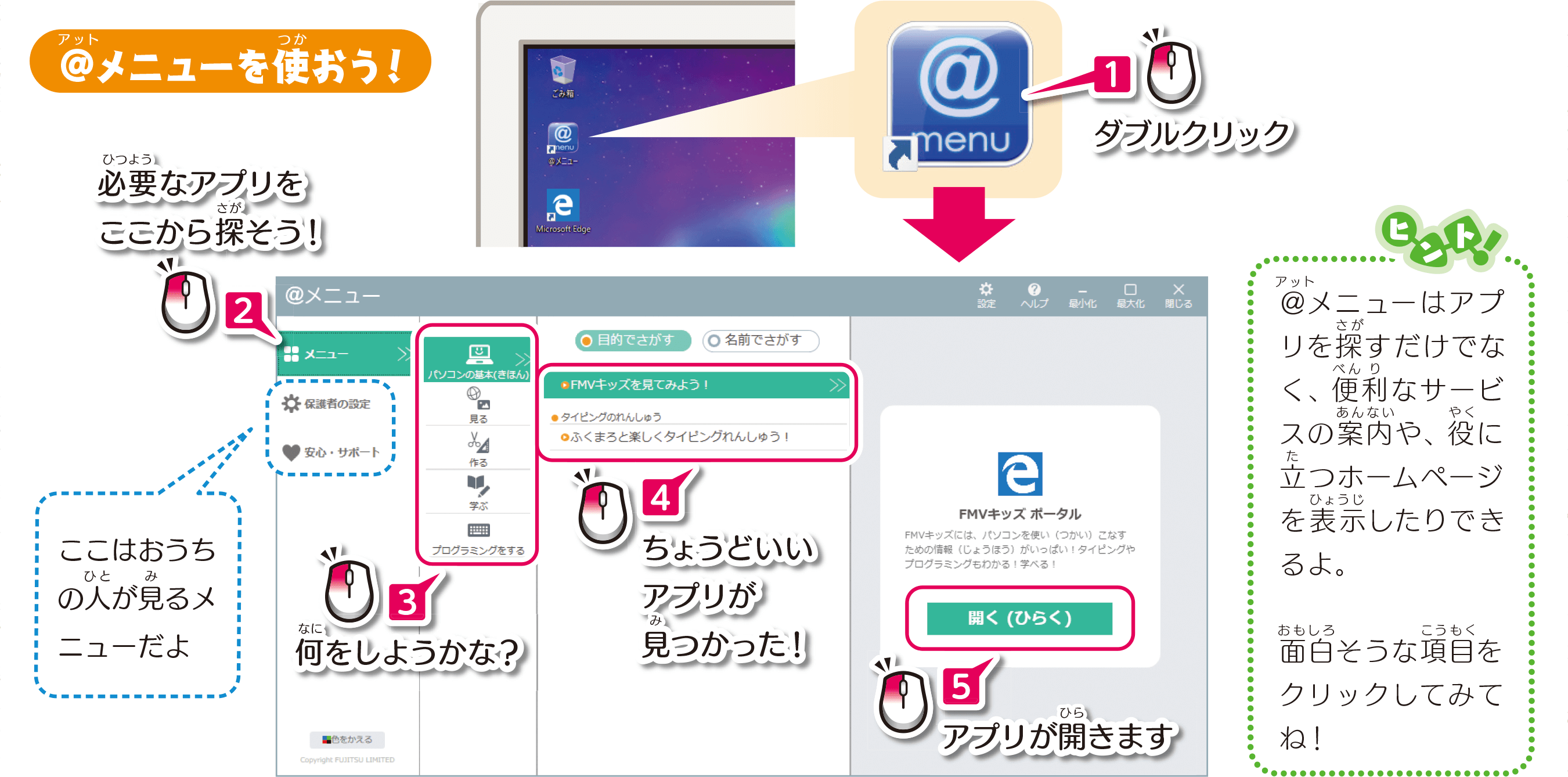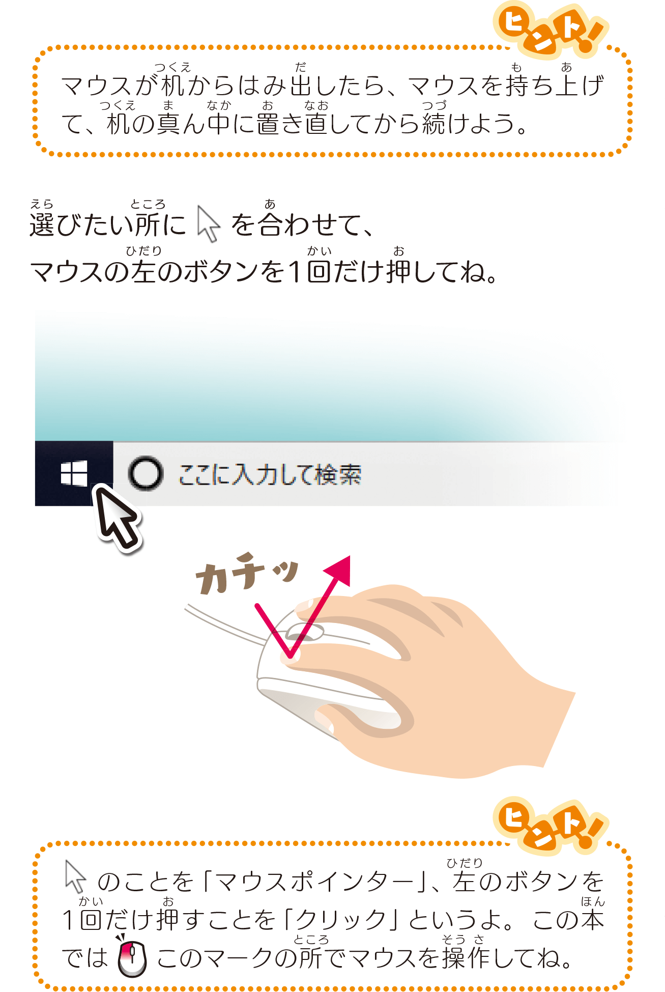 パソコンを使いはじめて、ワクワク、ドキドキしてるかな?たくさんさわって、使い方をおぼえてね。 でもその前に、3つのやくそくがあるよ。