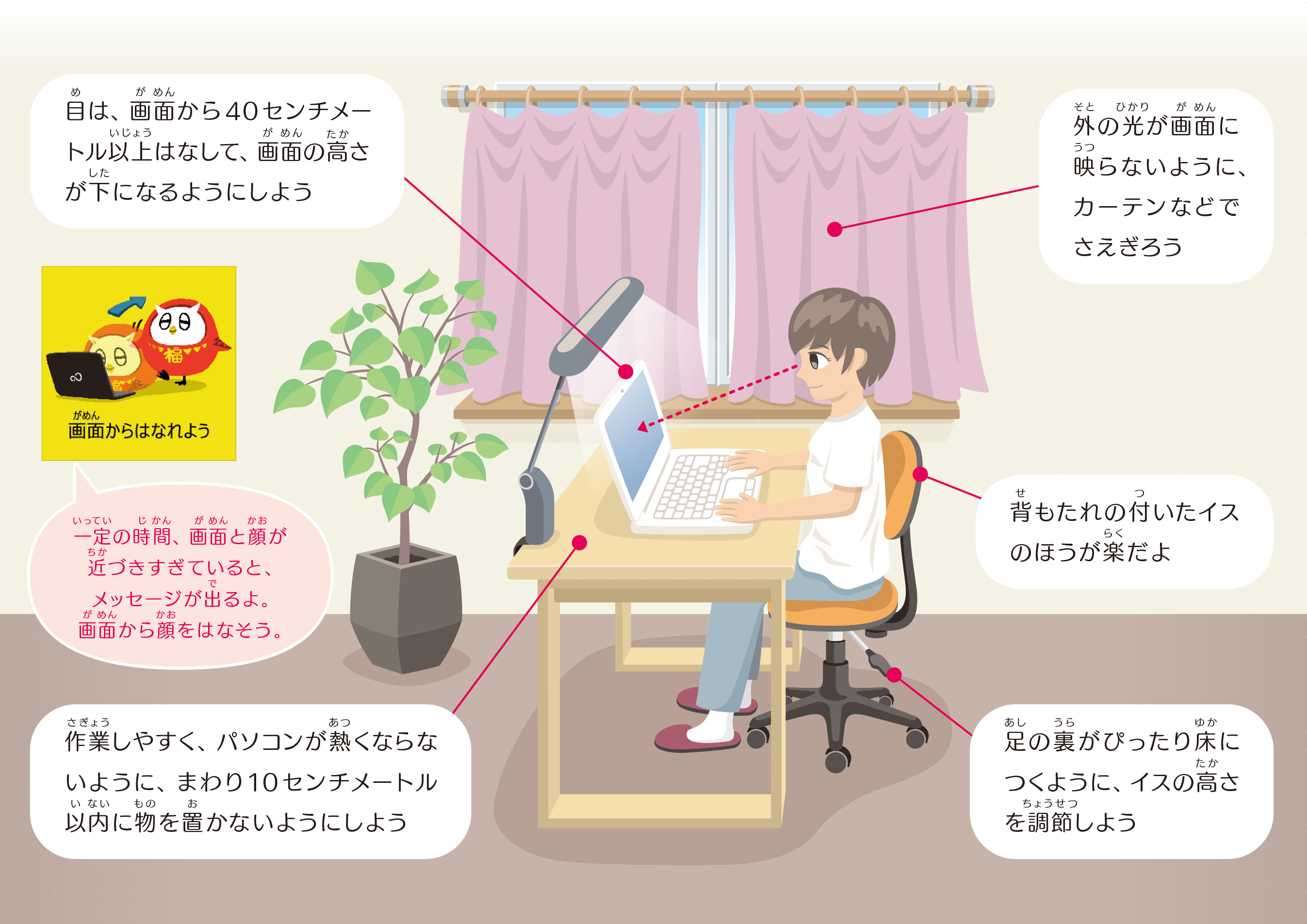 健康のため、かんきょうを整えて、休けいも十分取ろう。