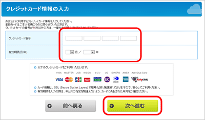 お支払いに使用するクレジットカード情報を入力して、[次へ]をクリックします。入力したクレジットカード情報は、お申し込み完了時にお客様のユーザー情報と共に登録されます。