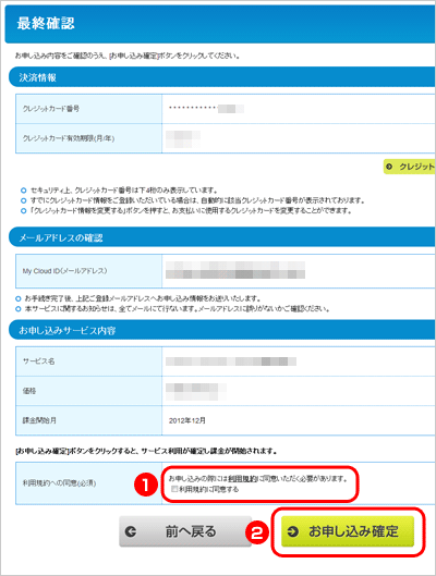 利用規約をご確認のうえ、「利用規約に同意する」にチェックを付け[お申し込み確定]ボタンをクリックします。