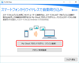 パソコンで「F-LINK Neo」を起動し、「自動取り込みの設定」をクリックします。「My Cloud アカウントでログイン」をクリックして、My Cloud アカウント(メールアドレス)とパスワードを入力します。(My Cloud アカウントお持ちでない場合は「アカウント新規登録」をクリックします。)