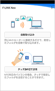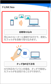 スマホとパソコンの連携が完了し、Wi-Fi接続すると写真の取り込みが可能となります。次回以降は、パソコンとWi-Fi接続するだけで、写真や動画の取り込み(差分)を自動で開始します。NFC対応のスマホの場合は、「タッチ[NFC]で送信」をタップします。