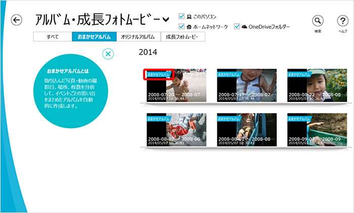 「おまかせアルバム」は、パソコンが自動で作成します。取り込んだデータの撮影日付や枚数、撮影場所などの情報を分析して思い出ごとにまとめたアルバムが作成されます。また作成されたアルバムをお気に入りに登録することもできます。