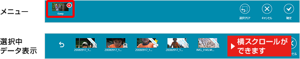 - アルバム作成中に、画面左下の「Keep」部分をクリックすることで選択されているデータの一覧を表示できます。この画面でサムネイルをクリックすると、そのデータの選択を解除できます。また一覧表示状態からは左下のボタンをクリックすることで元の表示に戻ります。