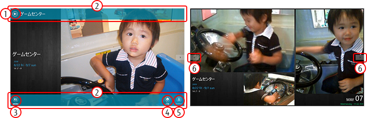 - アルバムに戻るときは、画面上でクリックをして、アプリバーを表示し、(1)「戻る」をクリックします。
