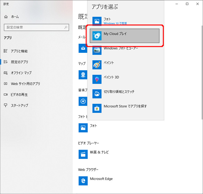 My Cloud プレイを、Windowsの既定のアプリとして設定することができます。既定のアプリとして設定すると、エクスプローラーなどからデータファイル(写真、動画、音楽)を開くだけでMy Cloud プレイが起動し、データが再生されるようになりますので大変便利です。既定のアプリとして設定するには、以下のように操作します。