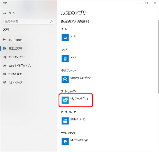 - 既定の「フォト ビューアー」として設定可能なアプリのリストが表示されますので、「My Cloud プレイ」をクリックします。