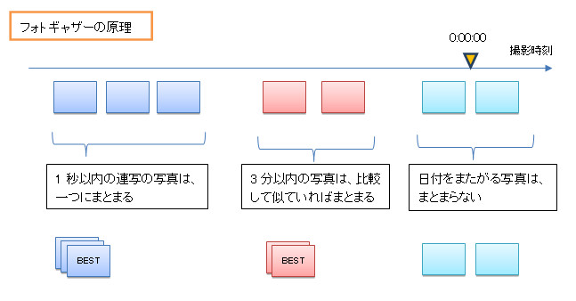 - フォトギャザーでまとめられる写真データは、撮影日時の差が3分以内のものが対象です。