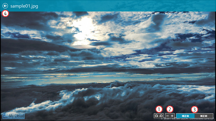 写真の表示を拡大または縮小させます。 - (3)補正後・補正前
