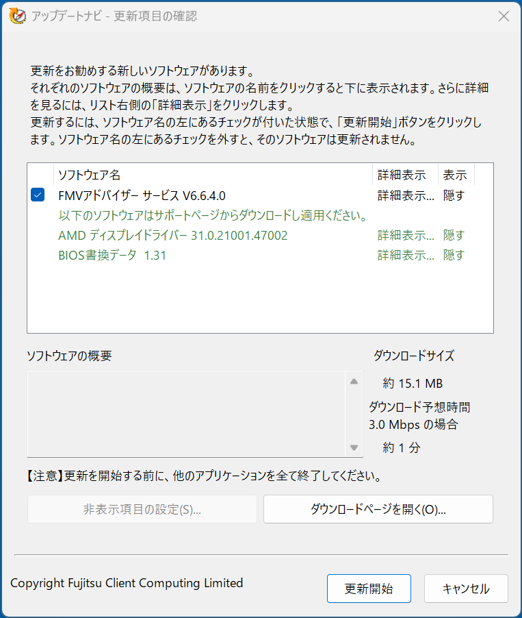 - 無線LANドライバーやBIOSなどのアップデートは、安全性を考慮し、お客様ご自身で内容をご確認のうえ手動で実施していただく仕組みとなっております。そのため、アップデートナビではあえて自動アップデートは行っておりません。更新通知が表示された際は、お客様のご判断で最適なタイミングにてアップデートをお願いいたします。