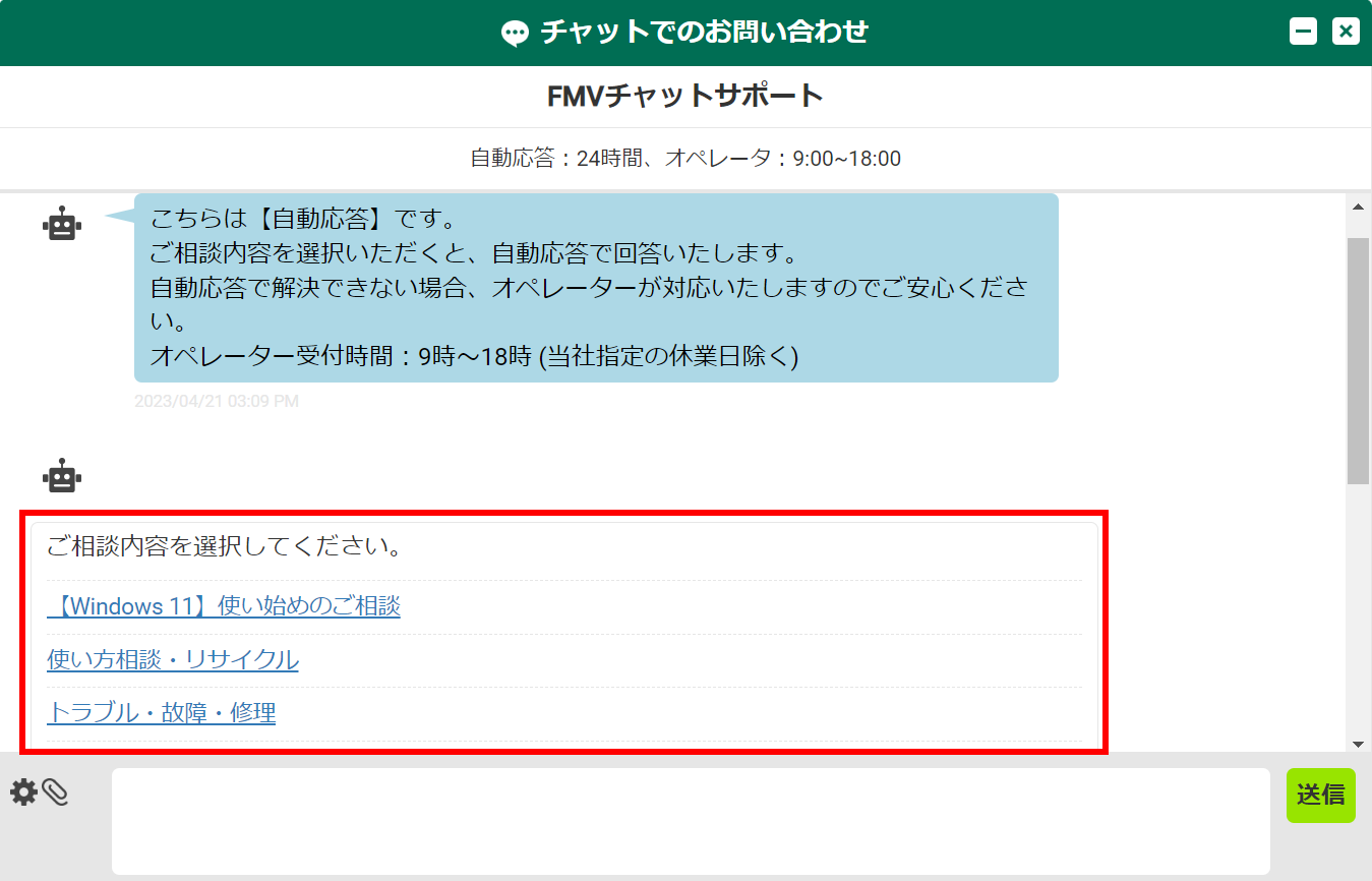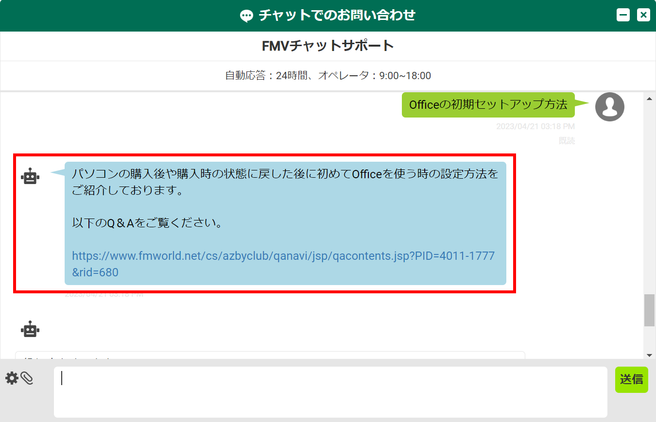 自動応答が24時間お困りごとに回答します。自動応答で解決しない場合はオペレーターが対応しますので安心して相談できます。