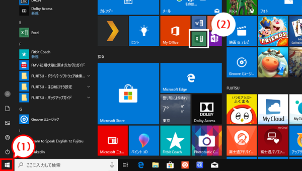 - (1)「スタート」ボタンをクリックし、(2)「スタート」メニューの「Excel」のタイルをクリックします。