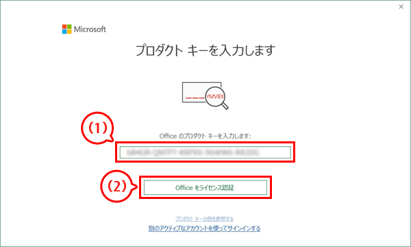 - (1)カードに記載されているプロダクト キーを入力し、(2)「Office をライセンス認証」ボタンをクリックします。