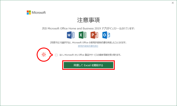 Office 2019ではOffice製品のうち、どれかひとつのソフトウェアを最初に起動した際に、次の手順で設定を行うことで、すべてのOffice製品の使用が可能となります。ここでは、「Excel」を最初に使用するソフトウェアとした場合を例に説明します。