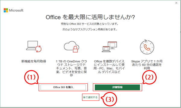 - 「Office 365 サービス」の画面が表示されます。お好みに応じてクリックします。ここでは例として「後で通知する」をクリックします。