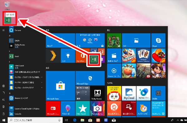 - デスクトップにショートカットを作りたいアプリのタイルをデスクトップ画面にドラッグアンドドロップします。
