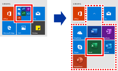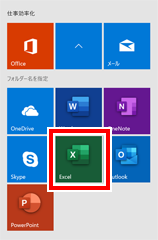 タイルがまとめられている場合は、クリックしてタイルを展開してから「Excel」のタイルをクリックします。