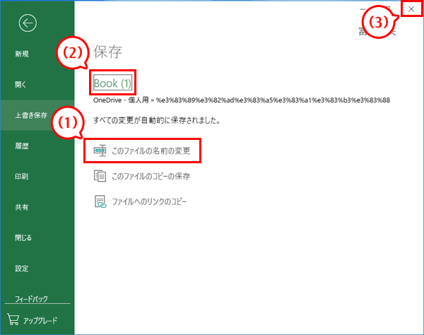 名前を変更したい場合は、(1)「このファイルの名前の変更」をクリックし、(2)名前を変更して(3)「×」をクリックして終了してください。
