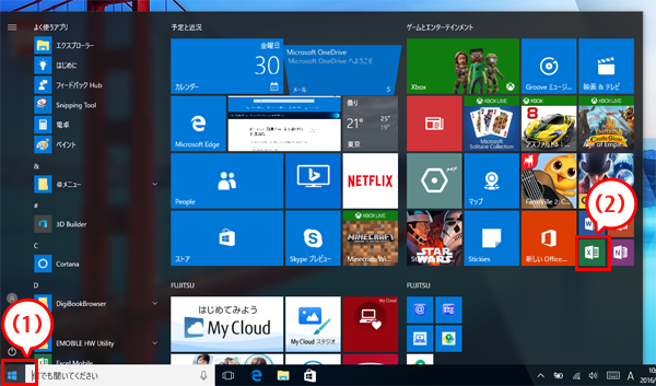- (1)「スタート」ボタンをクリックし、(2)エクセルのタイルをクリックします。