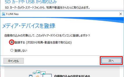 「登録する」にチェックを入れておくと、次回メディアを挿入すると自動的に写真をダウンロードし、この画面は表示されません。