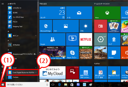 (1)スタートボタンをクリックし、(2)「Corel Digital Studio for FUJITSU」をクリックします。 表示されていない場合は、上下にスクロールしてください。