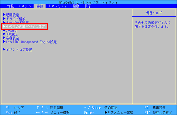 - 【↓】キーを数回押して「その他の内蔵デバイス設定」にカーソルを合わせ【Enter】キーを押します。