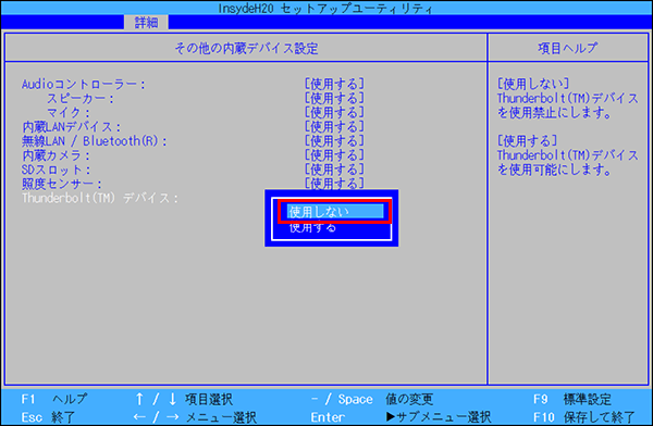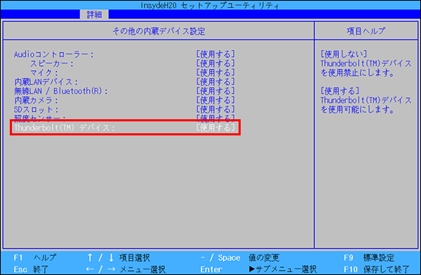 BIOSアップデート後、再度、上の手順でThunderboltの設定を「使用する」に戻します。