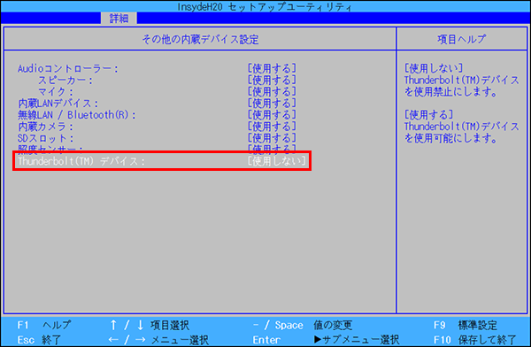 - 【↓】キーを数回押して「Thunderbolt(TM)デバイス」にカーソルを合わせ【Enter】キーを押します。