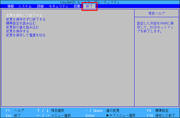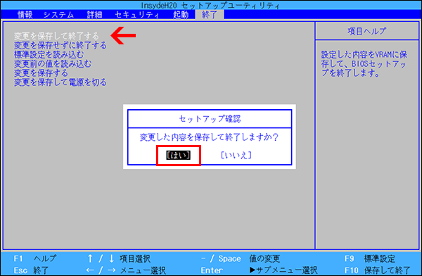 - 「変更を保存して終了する」にカーソルが合っていることを確認して【Enter】キーを押します。