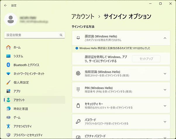 「設定」→「アカウント」→「サインイン オプション」→「顔認識(Windows Hello)」の項目に「このオプションは現在利用できません」と表示されます。