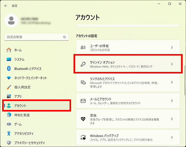 - 「アカウント」→「サインイン オプション」の順にクリックします。