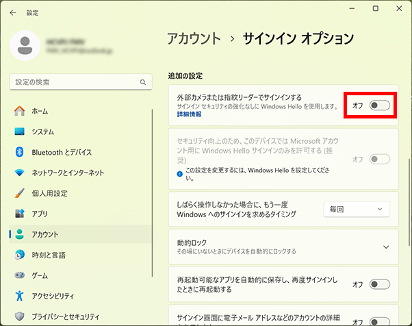 - 「外部カメラまたは指紋リーダーでサインインする」の項目の「オフ」をクリックして「オン」にします。