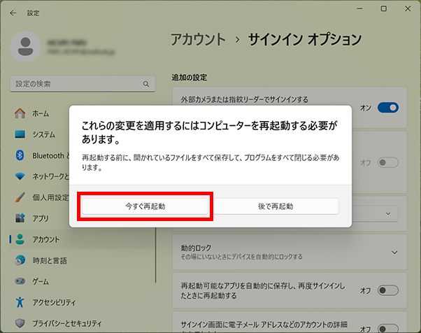 - 「これらの変更を適用するにはコンピューターを再起動する必要があります。」と表示されたら「今すぐ再起動」をクリックします。パソコンが再起動されます。