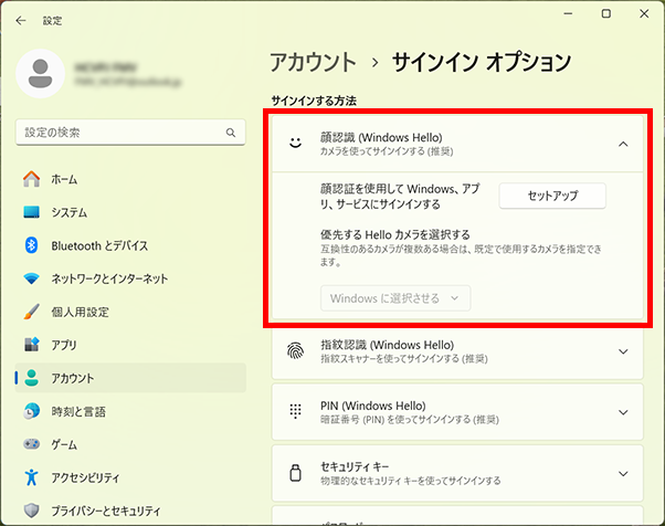以下の手順に従い、Windowsの設定を変更することでWindows Helloの顔認識機能が利用できるようになります。