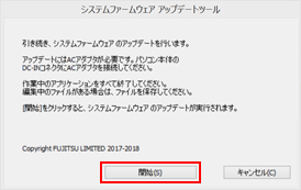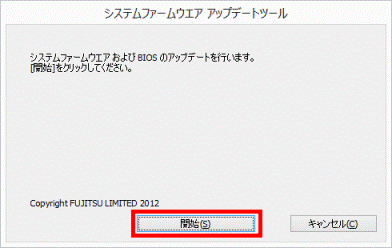 BIOSアップデートが終了して再起動したあとに、次のような画面が表示された場合は「開始」をクリックしてシステムファームウェアをアップデートしてください。