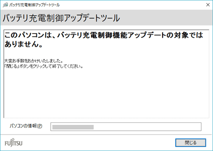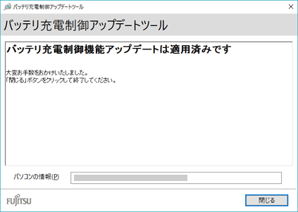 「バッテリ充電制御機能アップデートは適用済みです」と表示されたら、操作は終了です。アップデートを促す画面が表示された場合には、画面の指示に従って操作してください。