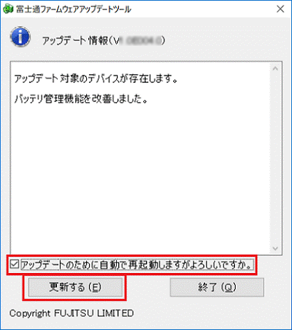 • この画面が表示されたら「アップデートのために自動で再起動しますがよろしいですか。」をクリックし、チェックを付けて、「更新する」ボタンをクリックします。