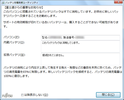 • 「バッテリ充電制御ユーティリティ」を適用すると、消耗したバッテリをお使いの場合、実際のバッテリ駆動時間(充電量)はアップデートを適用する前の約65%になります。