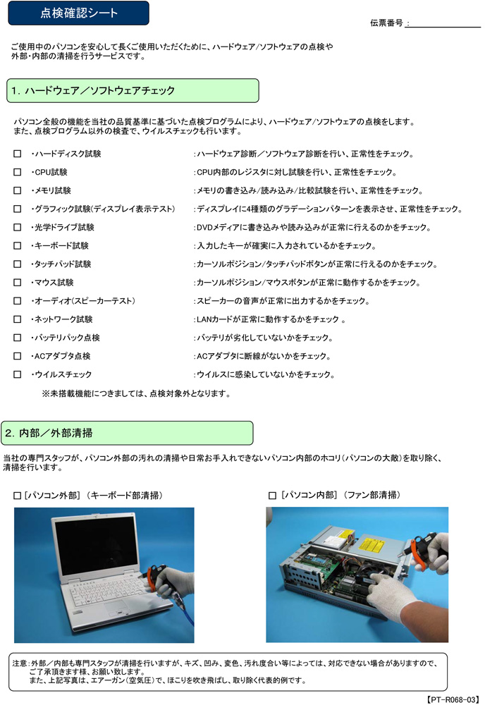 ハードウェア・ソフトウェアの点検や内部の清掃を行う有料サービスです。特に壊れてはいないけれど、ちょっと気になる点がある方や使い始めてから1年、2年といった節目に定期点検をしたいという方におすすめのサービスです。