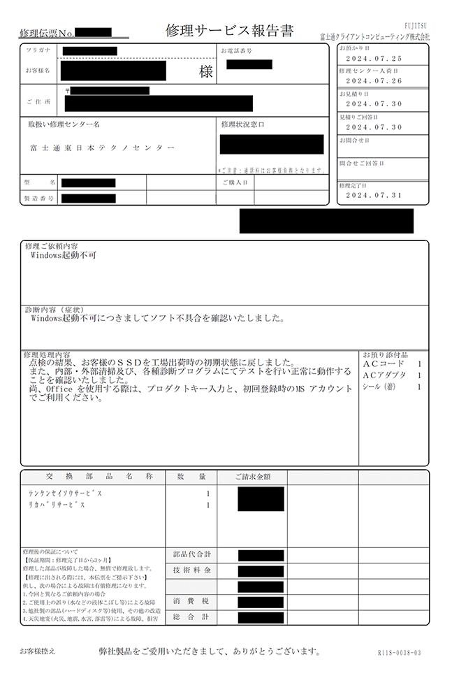 点検結果から、不具合の解決やより快適にご利用いただくためにお勧めする、オプションメニューをあわせてご提案します。- 提案したオプションメニューのご利用について、お知らせした日から1ヶ月を超えても、お客様からのご回答がなかった場合は、作業を実施せずお預かりしたパソコンを返却します。