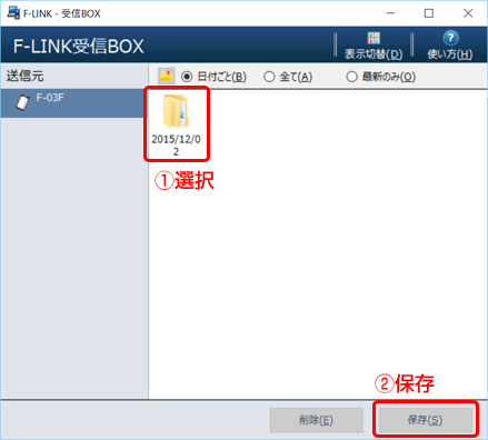 そのためファイルの保存が終了したあと、ファイルの削除をお勧めします。 - すべてのファイルのバックアップが完了したら[×]でF-LINK受信BOXを終了します。